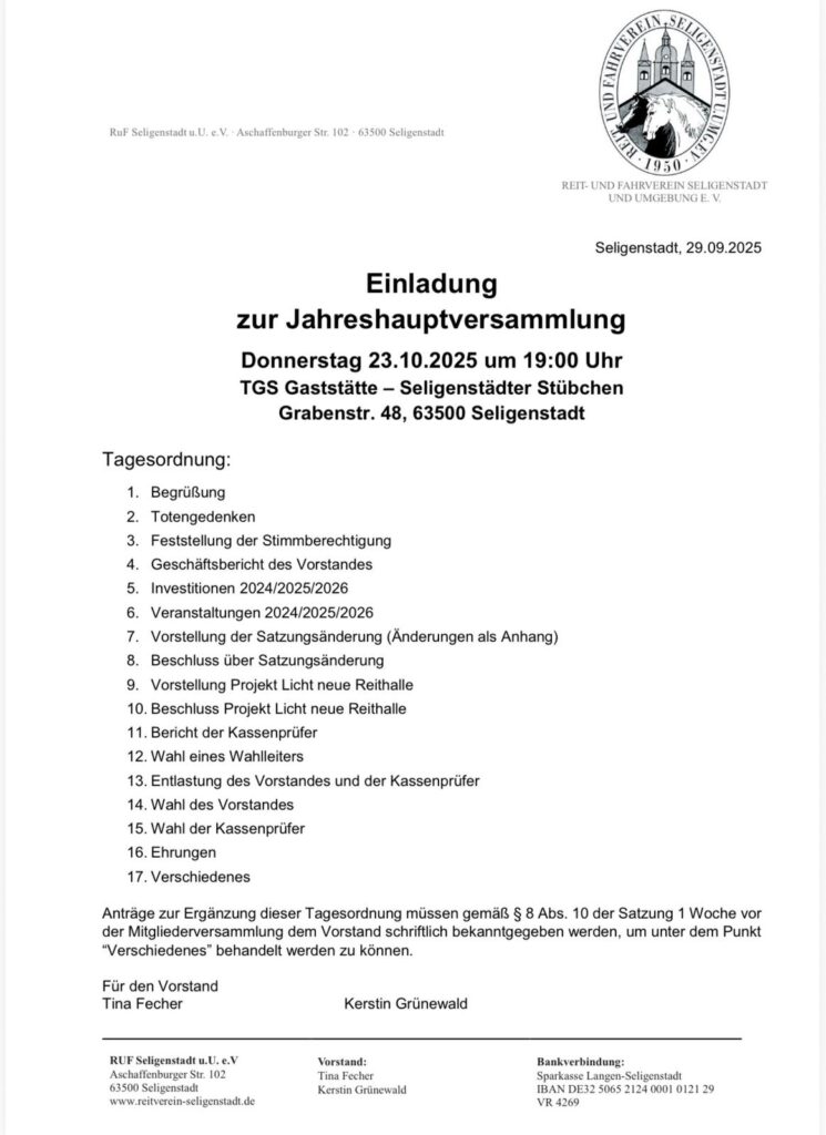 Wir hoffen auf eine zahlreiche Teilnahme, damit wir gemeinsam die Zukunft des Reitvereins aktiv gestalten und voranbringen können.