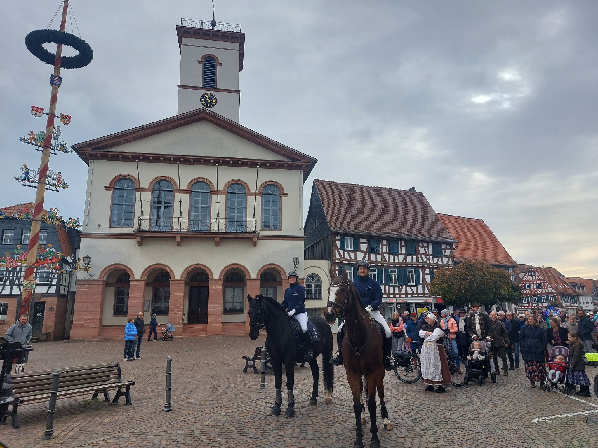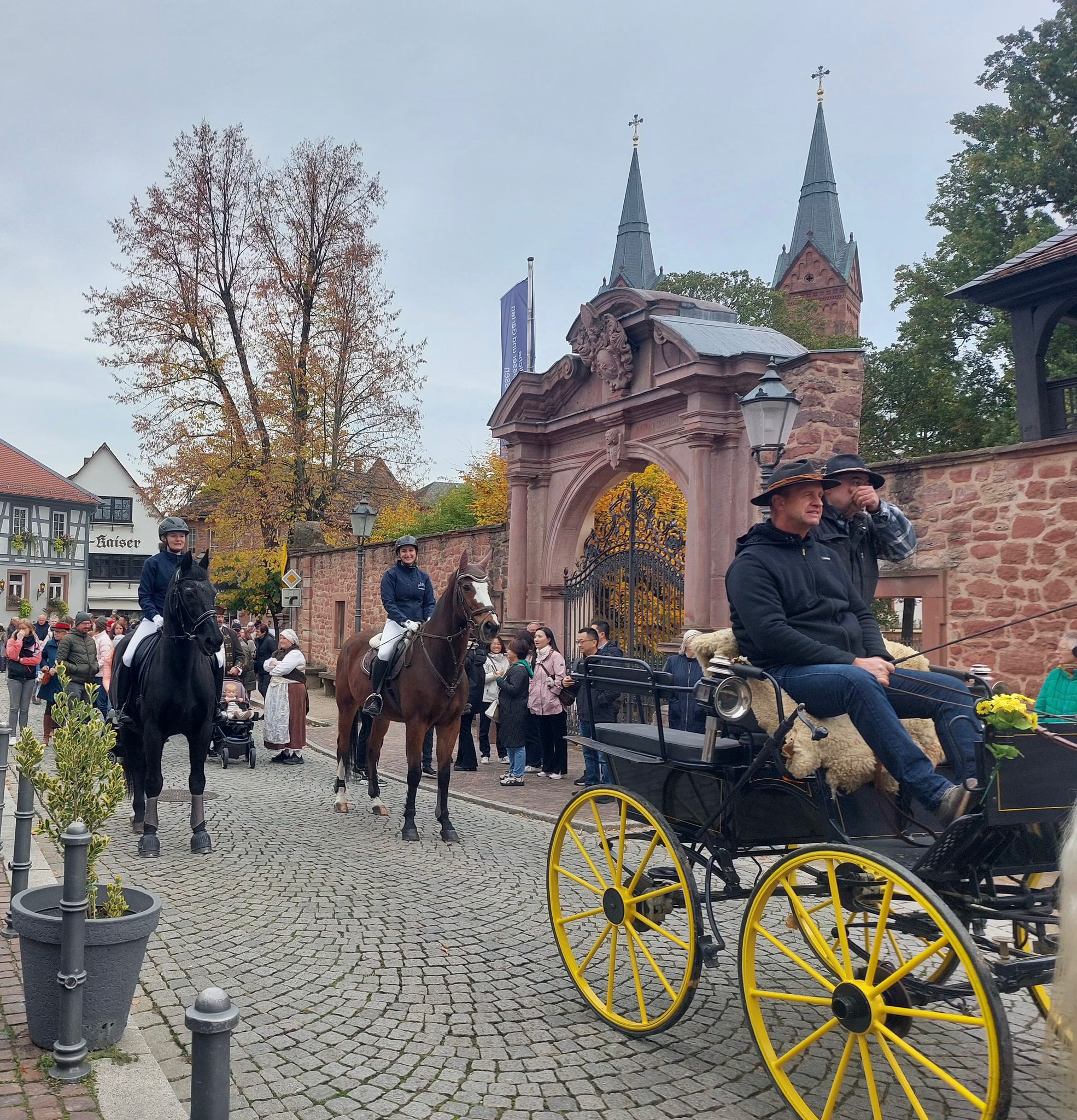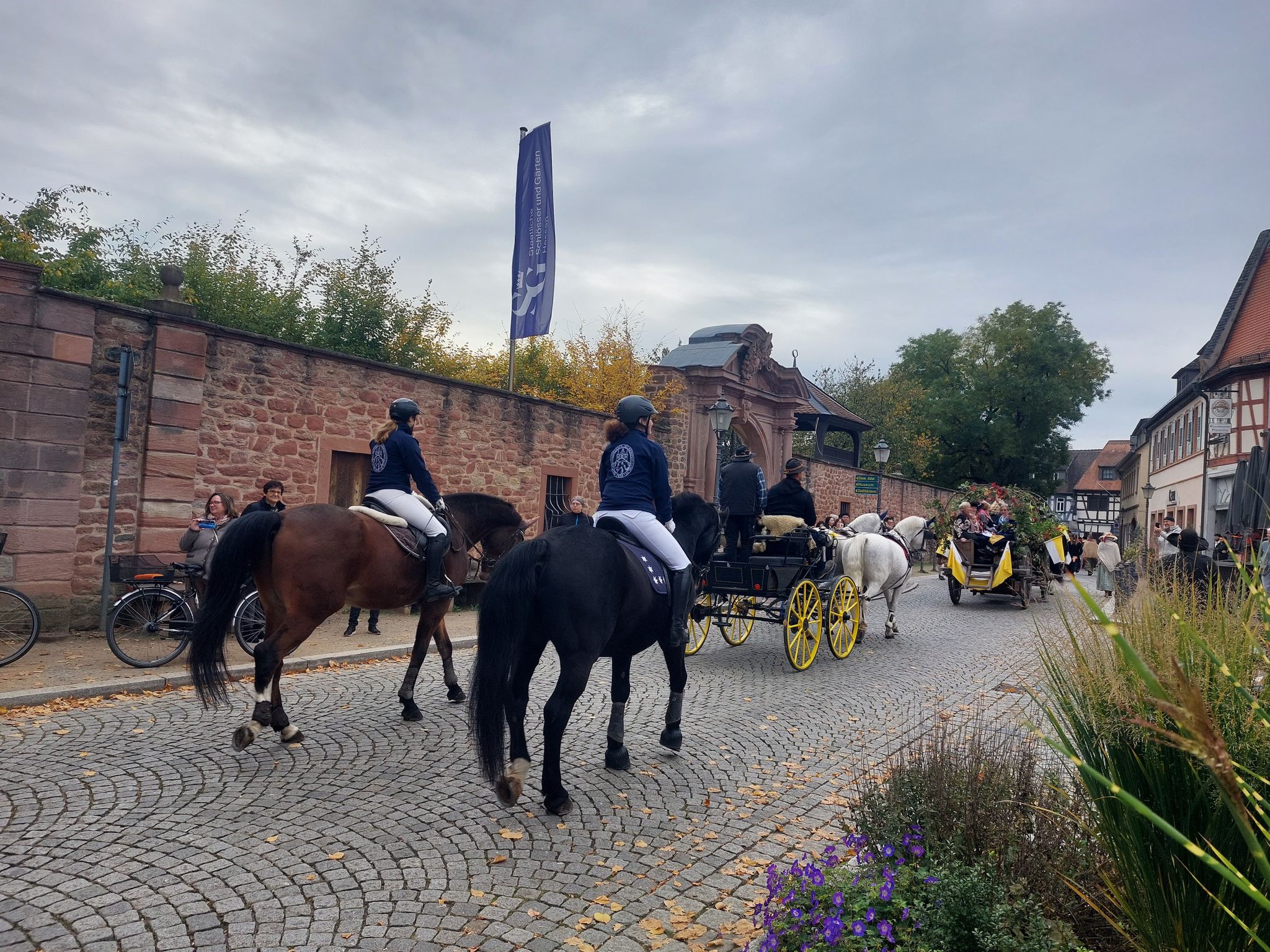 Unsere Vierbeiner haben sich vor Trommlern, Jagdhornbläsern, Kutschen und Zuschauern nicht aus der Ruhe bringen lassen. Wir waren mit den Pferden auf dem Marktplatz vor dem Rathaus, sind an der Feuerwehr vorbei und durch die schöne Altstadt gezogen. Ein kleiner aber für uns besondere Umzug, bei dem unsere Pferde die Straßen von Seligenstadt kennenlernen durften.